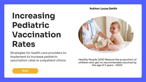 Stocksy. (n.d.). Happy baby smiling [Photograph]. https://www.stocksy.com/1347611/happy-baby-smiling Adobe Stock. (n.d.). West Virginia map with capital city [Photograph]. https://stock.adobe.com/images/west-virginia-map-with-capital-city/354526458 American Academy of Pediatrics. (2024). Talking with vaccine hesitant parents. https://www.aap.org/en/patient-care/immunizations/communicating-with-families-and-promoting-vaccine-confidence/talking-with-vaccine-hesitant-parents/ Bettenhausen, J., Winterer, C., & Colvin, J. (2021). Health and poverty of rural children: An under-researched and under-resourced vulnerable population. Academic Pediatric, 21(8), S126-S133. https://doi.org/10.1016/j.acap.2021.08.001 Centers for Disease Control and Prevention. (2023a). Making the vaccine decision: Addressing common concerns. Vaccines for Your Children. https://www.cdc.gov/vaccines/parents/why-vaccinate/vaccine-decision.html#:~:text=Vaccines%20can%20prevent%20common%20diseases,as%20measles%20and%20whooping%20cough. Centers for Disease Control and Prevention. (2023b). About the vaccines for children program (VFC). https://www.cdc.gov/vaccines/programs/vfc/about/index.html Columbia Mailman School of Public Health. (2021). The relationship between vaccines and herd immunity. https://www.publichealth.columbia.edu/news/relationship-between-vaccines-herd-immunity Columbia School of Nursing. (n.d.). High risk, underserved, or vulnerable populations. https://www.nursing.columbia.edu/research/research-areas-focus/high-risk-underserved-and-vulnerable-populations#:~:text=These%20include%20individuals%20who%20experience,those%20with%20certain%20medical%20conditions. Community Preventive Services Task Force. (n.d.a). Vaccination programs: Standing orders. https://www.thecommunityguide.org/findings/vaccination-programs-standing-orders.html Community Preventive Services Task Force. (n.d.b). Vaccination programs: Provider reminders. https://www.thecommunityguide.org/findings/vaccination-programs-provider-reminders.html Doctor Ana. (n.d.). Newborn checkup schedule [Photograph]. TopLine MD Alliance. https://www.toplinemd.com/ana-hpmd/newborn-checkup-schedule/ Düzgün, M. V. & Dalgiç, A. (2022). The effect of interventions on the prevention of parental vaccine refusal and hesitancy: A systematic review and meta-analysis of randomized controlled trials. Journal of Current Pediatrics / Guncel Pediatri, 20(3), 379-391. https://doi.org/10.4274/jcp.2022.13334 He, K., Mack, W. J., Neely, M., & Anand, V. (2022). Parental perspectives on immunizations: Impact of the COVID-19 pandemic on childhood vaccine hesitancy. Journal of Community Health, 47(1), 39-52. https://doi.org/10.1007/s10900-021-01017-9 Hest, R. (2024). Revised childhood vaccinations measure on state health compare shows vaccination rates vary by state, race/ethnicity, and insurance coverage. State Health Access Data Assistance Center. https://www.shadac.org/news/childhood-vaccinations-rate-by-state-ethnicity-insurance#:~:text=For%20example%2C%20in%202021%2C%20the,high%20as%2087.9%25%20in%20Iowa. Kroger, A., Bahta, L., Long, S., & Sanchez, P. (2023). General best practice guidelines for immunization: Best practice guidance. Vaccine Recommendations and Guidelines of the ACIP. https://www.cdc.gov/vaccines/hcp/acip-recs/general-recs/downloads/general-recs.pdf Northwoods Pediatric Center. (n.d.). What to expect at your child’s first appointment to the pediatrician [Photograph]. https://www.northwoodspediatric.com/2021/09/17/what-to-expect-at-your-childs-first-appointment-to-the-pediatrician/ Seisay, M. (2023). How multiracial families can preserve black culture for their children [Photograph]. https://www.parents.com/kindred/how-multiracial-families-can-preserve-black-culture-for-their-children/ Sinch Message Media. (2021). How to reduce no shows with text reminders for patients [Photograph]. https://messagemedia.com/us/blog/reduce-no-shows-text-reminders-patients/ Tiptipot Library. (n.d.). Your infant has a cold but no fever – Are they sick? [Photograph]. https://www.tiptipot.com/?CategoryID=461&ArticleID=486 UNCAS Health District. (2024). National infant immunization week: Protecting our littlest ones [Photograph]. https://uncashd.org/national-infant-immunization-week-protecting-our-littlest-ones/ United Nations Global Impact. (n.d.). Children’s rights. https://unglobalcompact.org/what-is-gc/our-work/social/childrens-rights University of Maryland School of Public Health. (2021). Redefining ‘health and well-being’ in Healthy People 2030 [Photograph]. https://sph.umd.edu/news/redefining-health-and-well-being-healthy-people-2030 West Virginia Legislature. (2024). House Bill 5105. https://www.wvlegislature.gov/Bill_Status/Bills_history.cfm?input=5105&year=2024&sessiontype=RS&btype=bill World Health Organization. (2015). Vaccine hesitancy: A growing challenge for immunization programmes. https://www.who.int/news/item/18-08-2015-vaccine-hesitancy-a-growing-challenge-for-immunization-programmes ZaggoCare. (2021). 10 tips to communicate better with doctors [Photograph]. https://zaggocare.org/communicate-better-with-doctors/