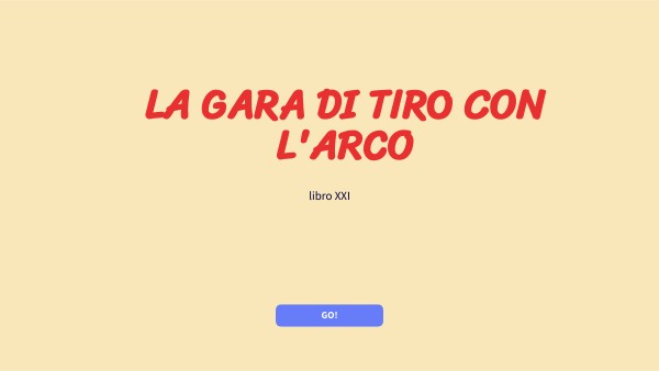 Ancora celato sotto le spoglie di mendicante, Odisseo chiede di partecipare alla gara. I Proci si oppongono con proteste e schiamazzi e sostengono che non è dignitoso concedergli di tentare la prova, ma Penelope e Telemaco sono di pa-rere contrario e affidano l’arco a quello che sembra a tutti un povero vecchio. ... Poi con la mano destra pizzicò e provò il nervo, che bene gli cantò sotto, simile a grido di rondine. Ma ai pretendenti strazio grande ne venne, a tutti il colore cambiò. E Zeus tuonò forte per dare il segno; e godette Odisseo costante, glorioso che gli mandasse un segno il figlio di Crono pensiero complesso. Prese la freccia rapida, ch’era davanti a lui sulla mensa, nuda, l’altre nella faretra capace stavano, e presto gli Achei le dovevan provare; L’arco pel mezzo afferrò, tirò nervo e cocca, dal suo posto, seduto sul seggio, e lasciò andare la freccia mirando dritto: non fallì di tutte le scuri, l’anello alto, ma li traversò e ne uscì fuori Il dardo greve di bronzo