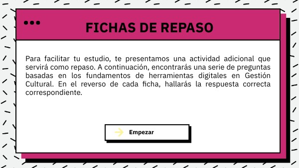 Para facilitar tu estudio, te presentamos una actividad adicional que servirá como repaso. A continuación, encontrarás una serie de preguntas basadas en los fundamentos de herramientas digitales en Gestión Cultural. En el reverso de cada ficha, hallarás la respuesta correcta correspondiente.