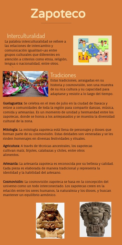 Guelaguetza: Se celebra en el mes de julio en la ciudad de Oaxaca y reúne a comunidades de toda la región para compartir danzas, música, comida y artesanías. Es un momento de unidad y hermandad entre los zapotecas, donde se honra a los antepasados y se muestra la diversidad cultural de la zona.