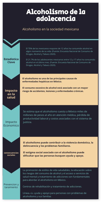 El 70% de los mexicanos mayores de 12 años ha consumido alcohol en algún momento de su vida. (Fuente: Encuesta Nacional de Consumo de Drogas, Alcohol y Tabaco 2020). El 21.7% de los adolescentes mexicanos entre 12 y 17 años ha consumido alcohol en el último mes. (Fuente: Encuesta Nacional de Consumo de Drogas, Alcohol y Tabaco 2020).