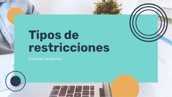 - Politica: gubernamentales o empresariales, estan llegan a limtar la producción la cual afecta la operación de laempresa. - Personal: la capacitación y disponibilidad del personal afecta en la produccipon. - Mercado: las condiciones del mercado, la demanda de productos o servicios y la competencia. Para resolver estas restricciones externas se usa el metodo llamado "arbol de realidad" el cual ayuda en la comprensión de las necesidades del mercado y adaptarse a ellas. Ejemplos: - Prohibición de numero de horas extra en la empresa - incumplimiento de entrega de productos, por falta de insumos del proveedor -limitación por el tamaño del mercado como restricción para el crecimiento -competidores con menor precio general en el mismo servicio - no se cubre la demanda impuesta, por la escasez de la oferta disponible en el mercado