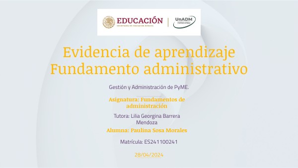 En esta presentación se abordarán las escuelas, teorías o corrientes mas relevantes de la administración, con sus aportaciones y representantes de cada una para conocerlas mejor. También, se dará un ejemplo de cuál escuela, tería o corriente podría aplicar en la PYME de mi elección, respecto al problema que tiene. Asimismo, se presentarán datos sombre dicha PYME y en que área se presenta la problemática.