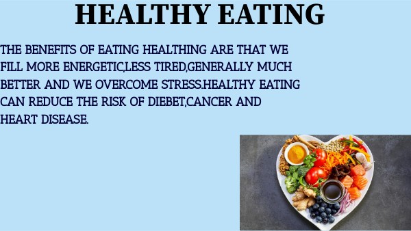 THE BENEFITS OF EATING HEALTHING ARE THAT WE FILL MORE ENERGETIC,LESS TIRED,GENERALLY MUCH BETTER AND WE OVERCOME STRESS.HEALTHY EATING CAN REDUCE THE RISK OF DIEBET,CANCER AND HEART DISEASE.
