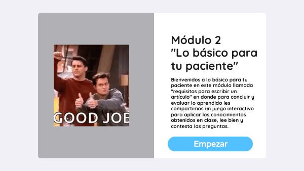 Bienvenidos a lo básico para tu paciente en este módulo llamada "requisitos para escribir un artículo" en donde para concluir y evaluar lo aprendido les compartimos un juego interactivo para aplicar los conocimientos obtenidos en clase, lee bien y contesta las preguntas.