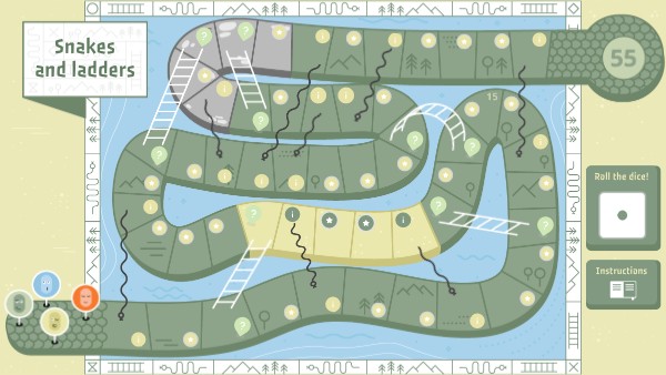 Players start with a token - which represents each of them - in the initial square and take turns rolling the die. The tokens move according to the numbering on the board, in ascending order. If, at the end of a move, a player lands on a square where a ladder begins, they move up it to the square where it ends. If, on the other hand, they land on a square where a snake's tail begins, they move down it to the square where its head ends. If a player rolls a 6, they can move twice in a single turn. If a player rolls three consecutive 6's, they must return to the initial square and cannot move their token until they roll a 6 again. The player who reaches the final square is the winner. There is a variation where, if a player is six or fewer squares away from the end, they must roll precisely the number needed to reach it. If the number rolled exceeds the number of remaining squares, the player cannot move.