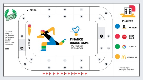 Choose a token, roll the dice and try to reach the goal before anyone else. Good luck!