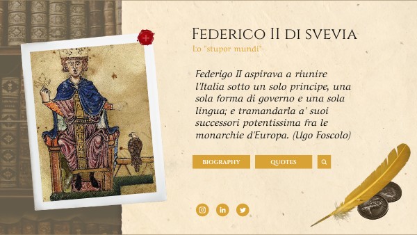 Federigo II aspirava a riunire l'Italia sotto un solo principe, una sola forma di governo e una sola lingua; e tramandarla a' suoi successori potentissima fra le monarchie d'Europa. (Ugo Foscolo)