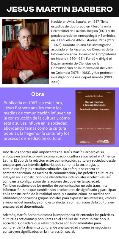Uno de los aportes más importantes de Jesús Martín Barbero es su enfoque en la relación entre comunicación, cultura y sociedad en América Latina. El aborda la relación entre comunicación, cultura y sociedad desde una perspectiva interdisciplinaria, que combina la sociología, la comunicación y los estudios culturales. Su enfoque se centra en comprender cómo los medios de comunicación y las prácticas culturales influyen en la construcción de identidades individuales y colectivas, así como en la configuración de relaciones de poder en la sociedad. Tambien sostiene que los medios de comunicación no solo transmiten información, sino que también son productores de significado y participan en la construcción de la realidad social y examina cómo los medios son utilizados por diversos grupos sociales para expresar sus intereses, valores y visiones del mundo, y cómo esto afecta la configuración de la cultura en una sociedad determinada. Además, Martín Barbero destaca la importancia de entender las prácticas culturales cotidianas y populares en el análisis de la comunicación y la sociedad. Considera que estas prácticas son fundamentales para comprender la dinámica cultural de una sociedad y cómo se negocian y construyen significados en la interacción social.