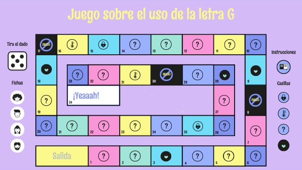 Partiendo desde la casilla de salida, tendréis que ir tirando el dado y respondiendo a todas las preguntas. Cuando la respuesta sea incorrecta, pasará vuestro turno y tendréis que pensarlo para más tarde. El equipo ganador será el que consiga llegar a la casilla de llegada. ¡Mucha suerte!