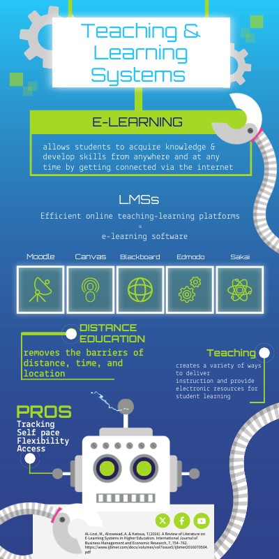AL-Lozi, M., Alrowwad, A. & Katoua, T.(2016). A Review of Literature on E-Learning Systems in Higher Education. International Journal of Business Management and Economic Research, 7, 754–762. https://www.ijbmer.com/docs/volumes/vol7issue5/ijbmer2016070504.pdf