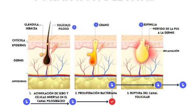 Explicación de la fisiopatología en el acné inflamatorio.