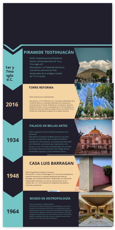 Estilo: Arquitectura contemporánea Descripción: La Torre Reforma es un rascacielos emblemático de la Ciudad de México y un ejemplo destacado de la arquitectura contemporánea en el país. Diseñada por el arquitecto mexicano Benjamín Romano, la torre se distingue por su forma esbelta y su fachada de vidrio que refleja el paisaje urbano circundante. Es un símbolo de modernidad y progreso en la capital mexicana.