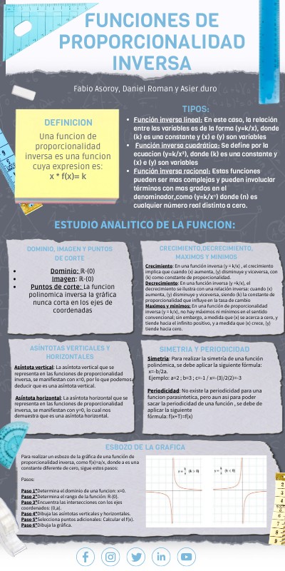 Para realizar un esbozo de la gráfica de una función de proporcionalidad inversa, como f(x)=a/x, donde a es una constante diferente de cero, sigue estos pasos: Pasos: Paso 1ºDetermina el dominio de una funcion: x=0.Paso 2ºDetermina el rango de la función: R-{0}.Paso 3ºEncuentra las intersecciones con los ejes coordenados: (0,a).Paso 4ºDibuja las asíntotas verticales y horizontales.Paso 5ºSelecciona puntos adicionales: Calcular el f(x).Paso 6ºDibuja la gráfica.