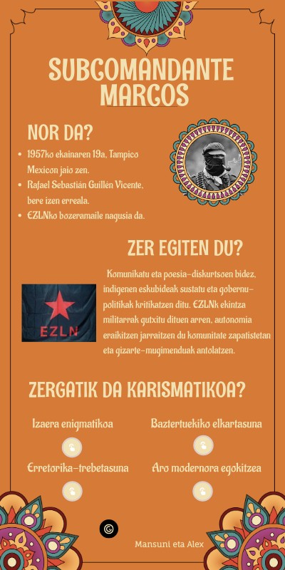 Komunikatu eta poesia-diskurtsoen bidez, indigenen eskubideak sustatu eta gobernu-politikak kritikatzen ditu. EZLNk ekintza militarrak gutxitu dituen arren, autonomia eraikitzen jarraitzen du komunitate zapatistetan eta gizarte-mugimenduak antolatzen.