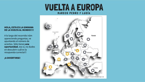HOLA, ESTA ES LA GIMKANA DE LA VUELTA AL MUNDO!!!! A lo largo del recorrido irám apareciendo preguntas, ve apuntando el número de aciertos. Sólo tienes una oportunidad, eso sí, no dudes en descubrir cuál es la resupuesta currecta!!! ¡A DIVERTIRSE!