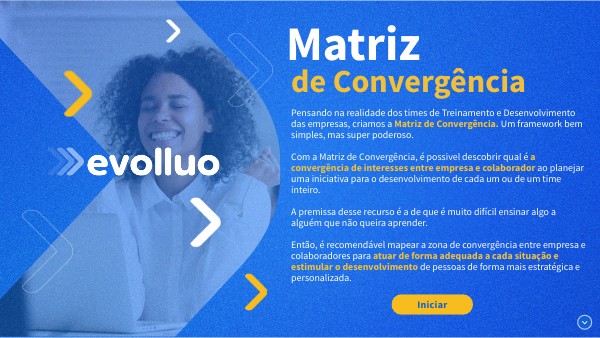 Pensando na realidade dos times de Treinamento e Desenvolvimento das empresas, criamos a Matriz de Convergência. Um framework bem simples, mas super poderoso. Com a Matriz de Convergência, é possivel descobrir qual é a convergência de interesses entre empresa e colaborador ao planejar uma iniciativa para o desenvolvimento de cada um ou de um time inteiro.A premissa desse recurso é a de que é muito difícil ensinar algo a alguém que não queira aprender. Então, é recomendável mapear a zona de convergência entre empresa e colaboradores para atuar de forma adequada a cada situação e estimular o desenvolvimento de pessoas de forma mais estratégica e personalizada.