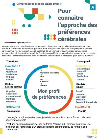 Vous venez de recevoir votre proƼl de préférences cérébrales.Vous voulez mieux comprendre la signiƼcation des résultats qui y Ƽgurent. Vous désirez aussi en tirer des applications pour votre développement personnel.Ce chapitre est conçu pour vous aider.