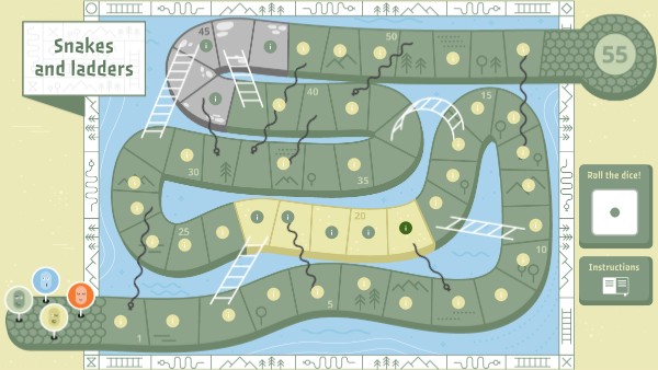 Players start with a token - which represents each of them - in the initial square and take turns rolling the die. The tokens move according to the numbering on the board, in ascending order. If, at the end of a move, a player lands on a square where a ladder begins, they move up it to the square where it ends. If, on the other hand, they land on a square where a snake's tail begins, they move down it to the square where its head ends. If a player rolls a 6, they can move twice in a single turn. If a player rolls three consecutive 6's, they must return to the initial square and cannot move their token until they roll a 6 again. The player who reaches the final square is the winner. There is a variation where, if a player is six or fewer squares away from the end, they must roll precisely the number needed to reach it. If the number rolled exceeds the number of remaining squares, the player cannot move.