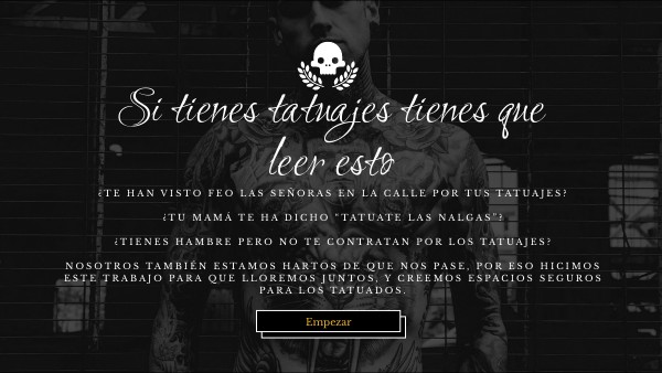 ¿Te han visto feo las señoras en la calle por tus tatuajes? ¿Tu mamá te ha dicho “tatuate las nalgas”? ¿Tienes hambre pero no te contratan por los tatuajes? Nosotros también estamos hartos de que nos pase, por eso hicimos este trabajo para que lloremos juntos, y creemos espacios seguros para los tatuados.