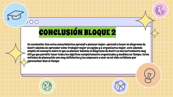 En conclusión: Con estos conocimientos aprendi a planear mejor, aprendí a hacer un diagrama de Gantt además de aprender cómo trabajar mejor en equipo y a organizarse mejor, esto además amplía mi concepto sobre lo que es planear Además el diagrama de Gantt es una herramienta muy útil ya que permite tener todos los objetivos completamente organizados y medidos en tiempo. Estos métodos de planeación son muy deficientes y los empezare a usar en mi vida cotidiana par aprovechar bien el tiempo