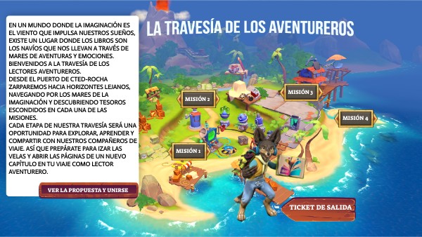 En un mundo donde la imaginación es el viento que impulsa nuestros sueños, existe un lugar donde los libros son los navíos que nos llevan a través de mares de aventuras y emociones. Bienvenidos a la Travesía de los Lectores Aventureros. Desde el puerto de CTED-Rocha zarparemos hacia horizontes lejanos, navegando por los mares de la imaginación y descubriendo tesoros escondidos en cada una de las misiones. Cada etapa de nuestra travesía será una oportunidad para explorar, aprender y compartir con nuestros compañeros de viaje. Así que prepárate para izar las velas y abrir las páginas de un nuevo capítulo en tu viaje como lector aventurero.