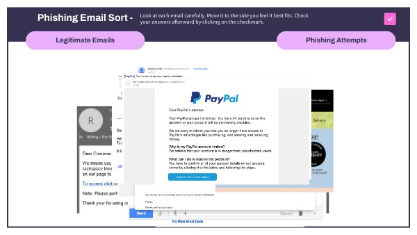 Look at each email carefully. Move it to the side you feel it best fits. Check your answers afterward by clicking on the checkmark.
