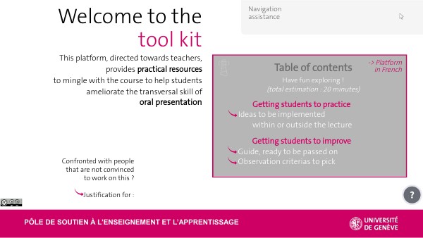 A requirement : learning outcome formally part of the university objectives ; and expertise to address to promote equal opportunity useful : « The oral presentation, from the various stages of preparation to presentation in class, constitutes a pedagogically relevant task in the light of prevailing learning theories » & necessary : self-perceived struggle in this area, from the beginning to the end of studies. Former students assessed that the university of Geneva did not support them developing this ability, considered essential in their profession