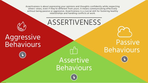 Assertiveness is about expressing your opinions and thoughts confidently while respecting others' views, even if they're different from yours. It means communicating effectively without being passive or aggressive. Assertiveness is a cruicial skill for fostering healthy relationships and handling conflicts at work.