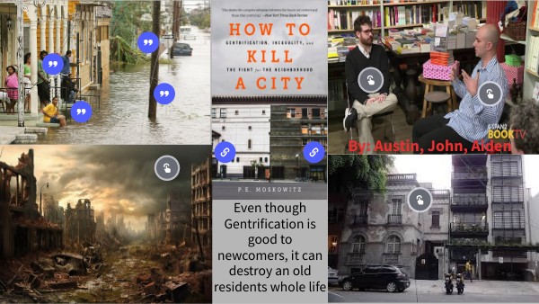 "Gentrification brings money, new people, and renovated real estate to cities, but it also kills them. It takes away the affordability and diversity that are required for unique and challenging culture. It sanitizes. And because it is obvious to most that this is happening(even hyper gentrifiers in New York and New Orleans mourn the loss of culture in those cities), no one wants to be seen as a gentrifier. Who would want to be held accountable for helping kill a city?" (page 57) The quote shows that over time things change the culture in that area, religion everything they believe in and show are going to eventually be gone due to gentrification as more people come and settle in that area and accentally that is killing the city they built on there own beliefs, religion, and culture.