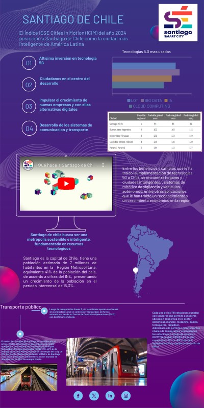Santiago de Chile como Smart City, busca un desarrollo sostenible, mediante gestión IoT y estrategia 5G, para conseguir ser una ciudad innovadora, sustentable y competitiva.