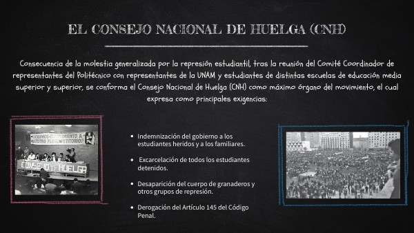 Consecuencia de la molestia generalizada por la represión estudiantil, tras la reunión del Comité Coordinador de representantes del Politécnico con representantes de la UNAM y estudiantes de distintas escuelas de educación media superior y superior, se conforma el Consejo Nacional de Huelga (CNH) como máximo órgano del movimiento, el cual expresa como principales exigencias: