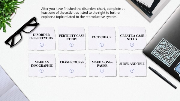 After you have finished the disorders chart, complete at least one of the activities listed to the right to further explore a topic related to the reproductive system.