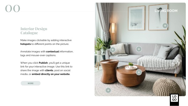 Make images clickable by adding interactive hotspots to different points on the picture. Annotate images with contextual information, tags and mouse-over captions. When you click Publish, you’ll get a unique link for your interactive image. Use this link to share the image with clients, post on social media, or embed directly on your website.