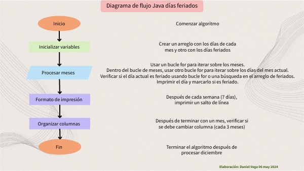 Usar un bucle for para iterar sobre los meses. Dentro del bucle de meses, usar otro bucle for para iterar sobre los días del mes actual. Verificar si el día actual es feriado usando bucle for o una búsqueda en el arreglo de feriados. Imprimir el día y marcarlo si es feriado.