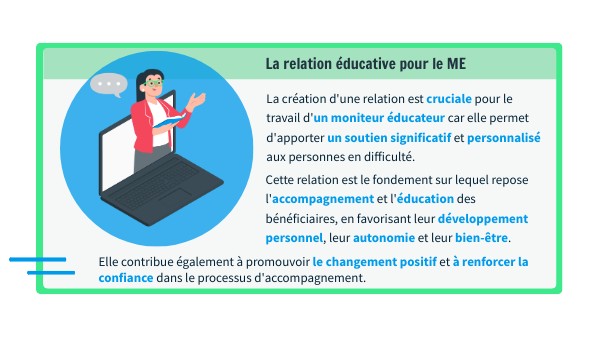 La création d'une relation est cruciale pour le travail d'un moniteur éducateur car elle permet d'apporter un soutien significatif et personnalisé aux personnes en difficulté.