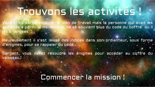 Vous étiez partis explorer le plan de travail mais la personne qui avait les activités a perdu la mémoire et ne se souvient plus du code du coffre où il les a rangées ! Heureusement il s'est laissé des indices dans son ordianteur, sous forme d'énigmes, pour se rappeler du code . Sergent, vous devez résoudre les énigmes pour accéder au coffre du vaisseau !