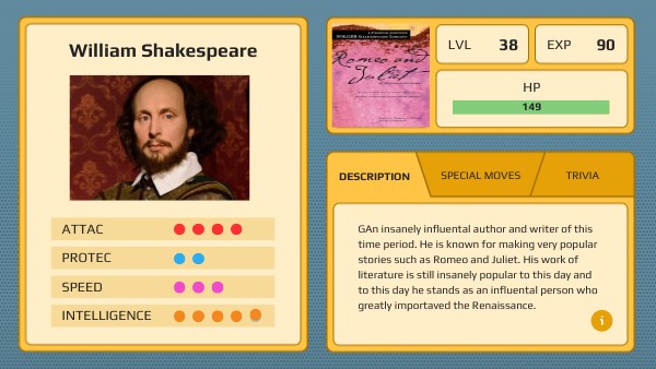 GAn insanely influental author and writer of this time period. He is known for making very popular stories such as Romeo and Juliet. His work of literature is still insanely popular to this day and to this day he stands as an influental person who greatly importaved the Renaissance.