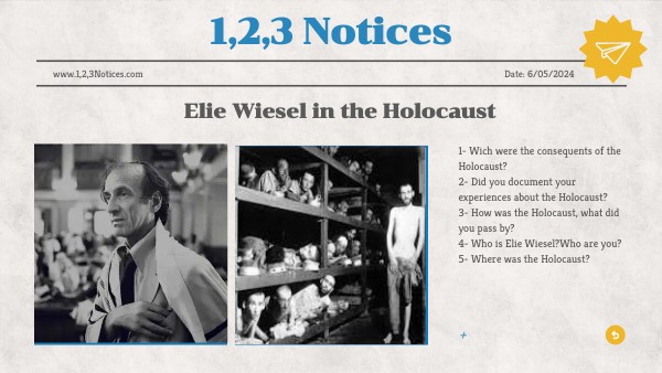 1- Wich were the consequents of the Holocaust?2- Did you document your experiences about the Holocaust? 3- How was the Holocaust, what did you pass by? 4- Who is Elie Wiesel?Who are you? 5- Where was the Holocaust?