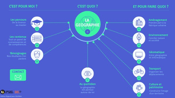 Des fondamentaux de la discipline aux spécificités régionales en passant par la maitrise des outils, les études de géographie te proposent d'acquérir des compétences et des connaissances liées aux enjeux actuels: risques, développement durable, environnement, aménagement, urbanisme, mobilités, transfrontalier, et d’y porter un regard critique pour acquérir une vision globale du territoire.