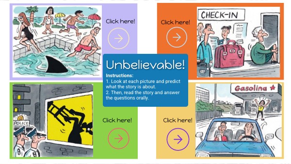 Instructions: 1. Look at each picture and predict what the story is about. 2. Then, read the story and answer the questions orally.