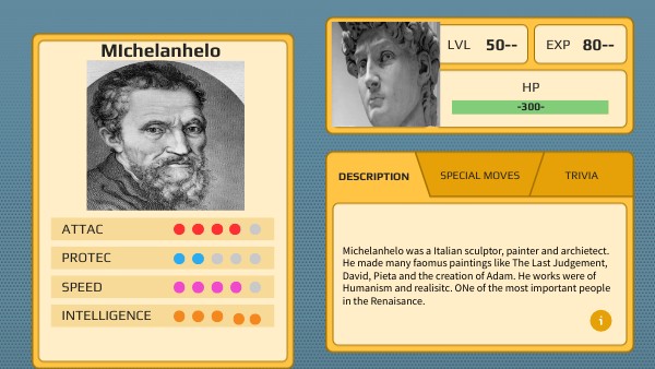 Michelanhelo was a Italian sculptor, painter and archietect. He made many faomus paintings like The Last Judgement, David, Pieta and the creation of Adam. He works were of Humanism and realisitc. ONe of the most important people in the Renaisance.