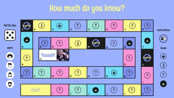 Partiendo desde la casilla de salida, tendréis que ir tirando el dado y respondiendo a todas las preguntas. Cuando la respuesta sea incorrecta, pasará vuestro turno y tendréis que pensarlo para más tarde. El equipo ganador será el que consiga llegar a la casilla de llegada. ¡Mucha suerte!