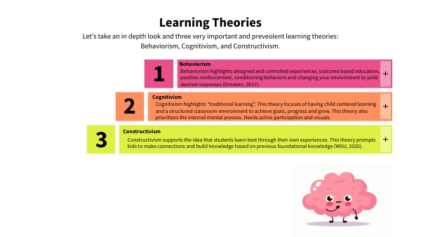 Let's take an in depth look and three very important and preveolent learning theories: Behaviorism, Cognitivism, and Constructivism.