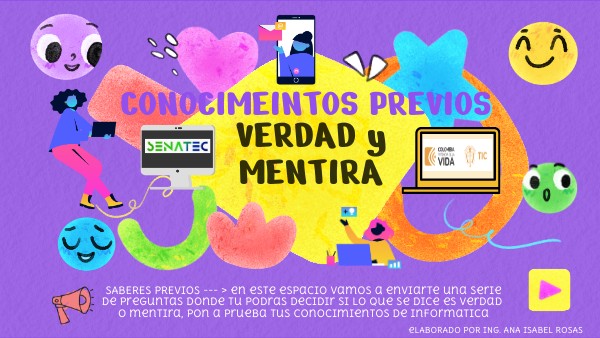 SABERES PREVIOS --- > en este espacio vamos a enviarte una serie de preguntas donde tu podras decidir si lo que se dice es verdad o mentira, pon a prueba tus conocimientos de informatica