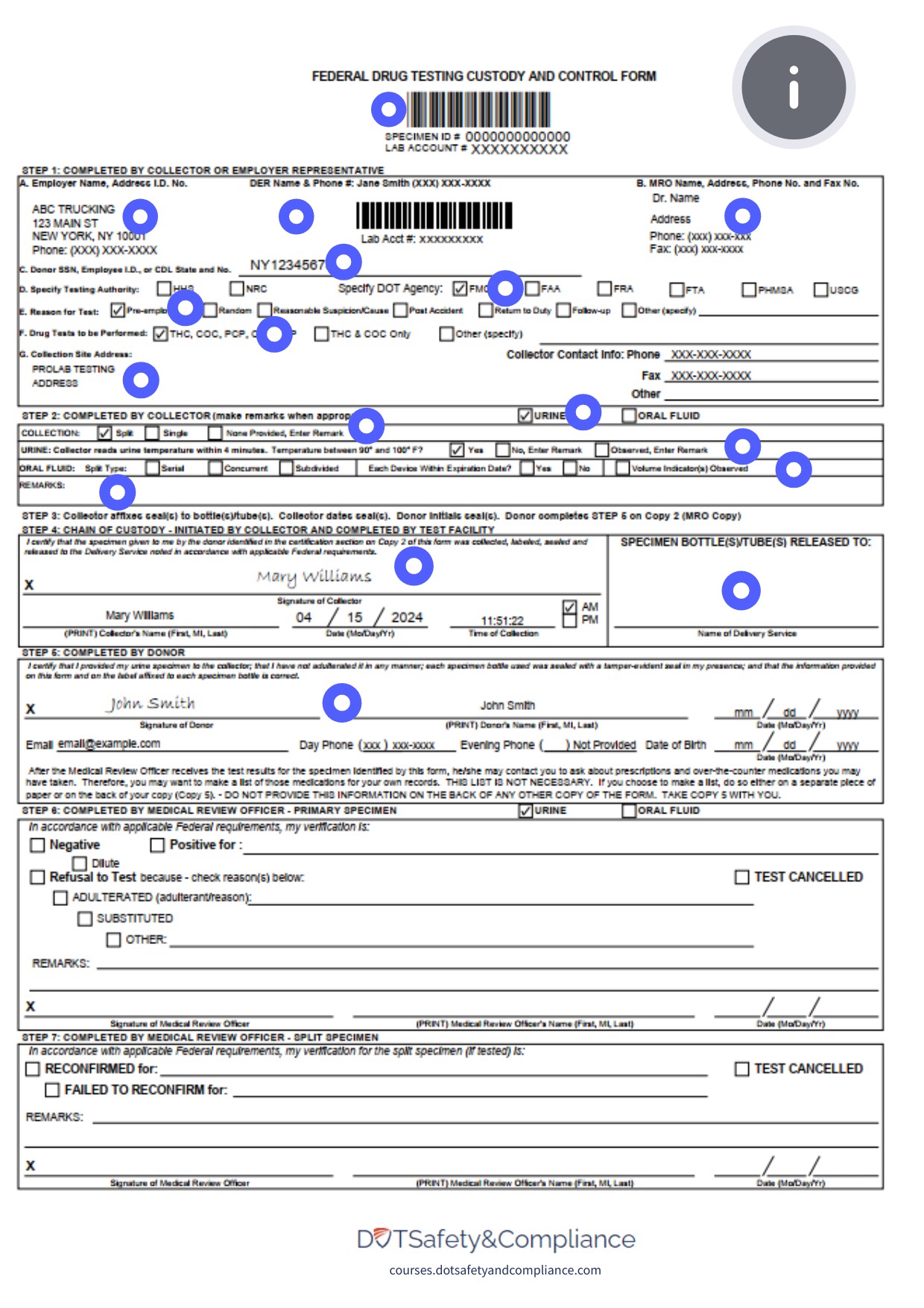 Click each button to learn more. The highlighted sections represent parts that you must ensure are correctly marked, and the information is correctly entered. Make sure you get a copy of the Custody and Control Form (CCF) copy 5 - Donor Copy (not the Test Facility Copy or other) from the collector.