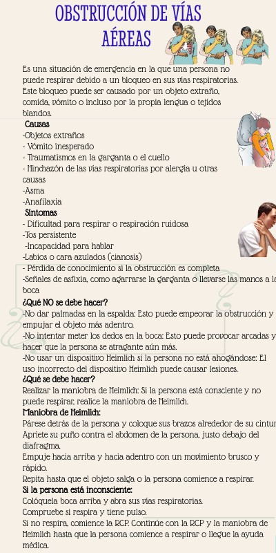 Es una situación de emergencia en la que una persona no puede respirar debido a un bloqueo en sus vías respiratorias. Este bloqueo puede ser causado por un objeto extraño, comida, vómito o incluso por la propia lengua o tejidos blandos. Causas -Objetos extraños - Vómito inesperado - Traumatismos en la garganta o el cuello - Hinchazón de las vías respiratorias por alergia u otras causas -Asma -Anafilaxia
