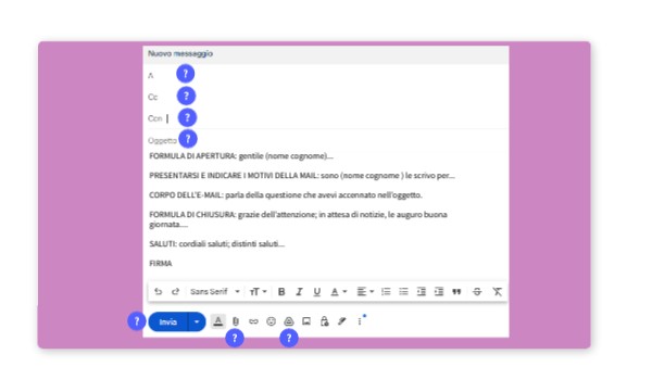 FORMULA DI APERTURA: gentile (nome cognome)... PRESENTARSI E INDICARE I MOTIVI DELLA MAIL: sono (nome cognome ) le scrivo per... CORPO DELL'E-MAIL: parla della questione che avevi accennato nell’oggetto. FORMULA DI CHIUSURA: grazie dell’attenzione; in attesa di notizie, le auguro buona giornata.... SALUTI: cordiali saluti; distinti saluti... FIRMA