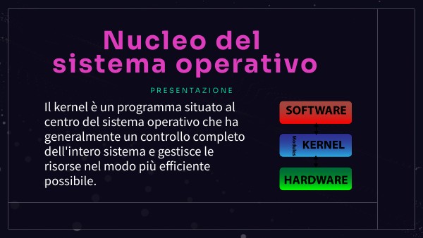 Il kernel è un programma situato al centro del sistema operativo che ha generalmente un controllo completo dell'intero sistema e gestisce le risorse nel modo più efficiente possibile.
