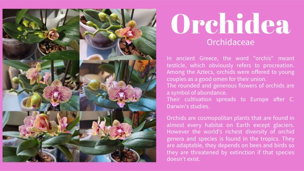 In ancient Greece, the word "orchis" meant testicle, which obviously refers to procreation. Among the Aztecs, orchids were offered to young couples as a good omen for their union. The rounded and generous flowers of orchids are a symbol of abundance. Their cultivation spreads to Europe after C. Darwin's studies.